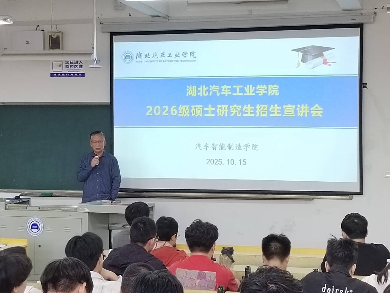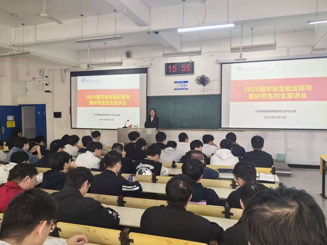 为扎实做好2026届毕业生就业服务工作,吸引更多优秀学生报考我校研究生,10月13日-16日,汽车智能制造学院组织开展2026届毕业生就业动员暨研究生招生宣讲系列活动。学院院长王保华、学院党委书记崔海英、副院长陈君宝、汽车传动优化与控制团队负责人任爱华、智能制造专业教师郭庆贺、各专业辅导员、班主任等分赴本部与襄阳基地,面向各专业毕业生进行政策解读、动员交流和考研慰问。