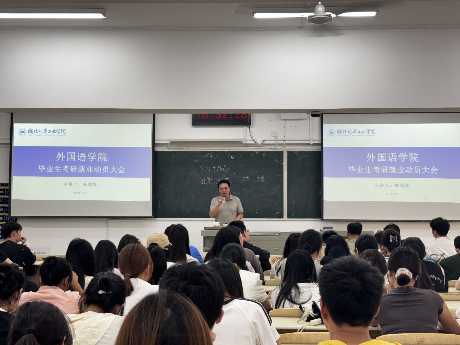 为帮助2025届毕业生坚定考研信心、明确考研目标、熟悉考研政策、了解就业形势、把握就业机会。外国语学院于9月27日下午在5201教室召开了外国语学院毕业生考研就业动员大会,会议由学院分党委副书记魏伟主持,2025届毕业生、部分2022级、2023级学生共计200人参加了会议。