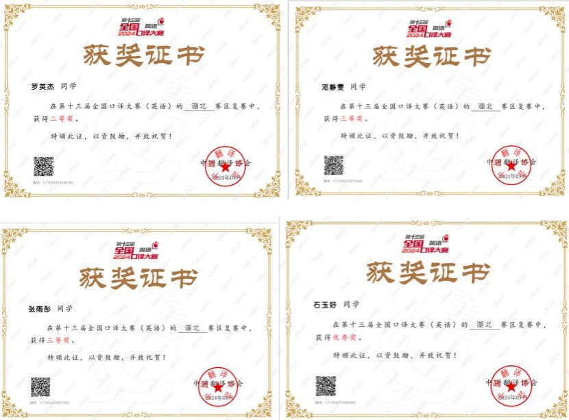 日前,第十三届全国口译大赛(英语)湖北赛区复赛结果公布。我校英语专业学子喜获二等奖1项、三等奖2项、优秀奖1项,何晓莉、陈琼老师荣获优秀指导老师奖,罗英杰、张雨彤、邓静雯成功晋级全国决赛。