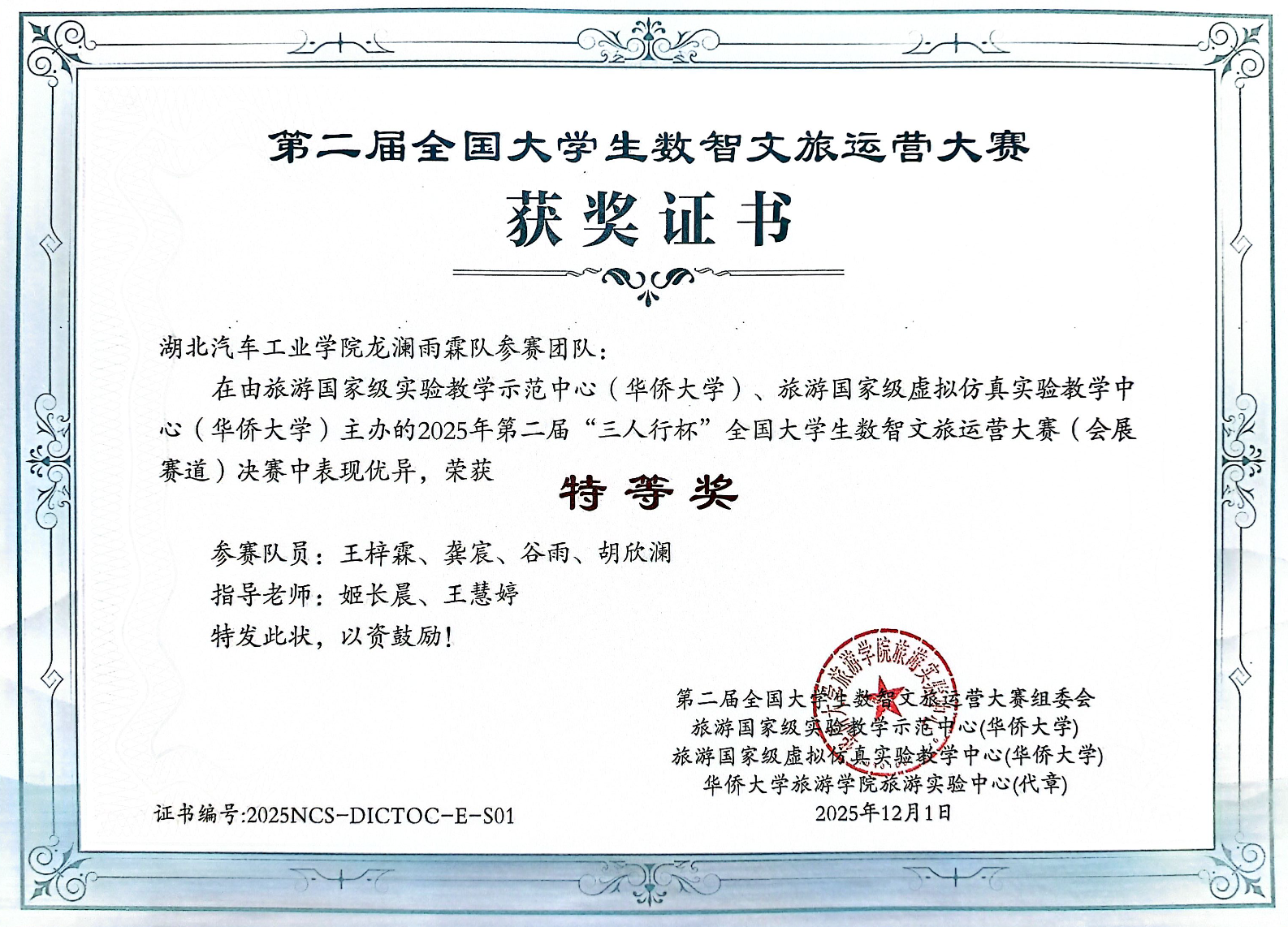 近日,第二届“三人行杯”全国大学生数智文旅运营大赛(会展数智运营决策赛道)圆满落幕。由姬长晨、王慧婷老师指导的“龙澜雨霖队”(队员:王梓霖、龚宸、谷雨、胡欣澜)在全国30个省份、百余所高校的500多支参赛队伍中脱颖而出,历经初赛、复赛、决赛层层角逐,最终斩获全国特等奖,充分展现了我院学子卓越的数智化运营能力与团队协作精神。